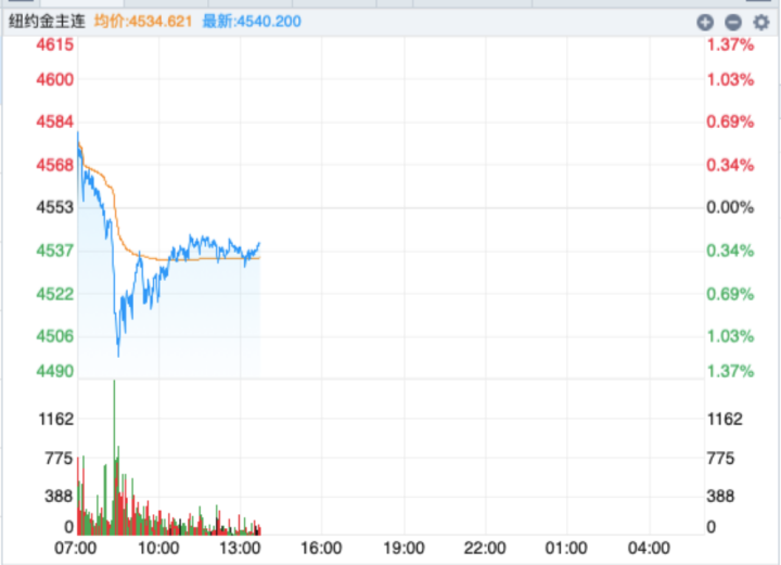 另外,纽约金今日也走出“V型反转”的走势。截至发稿,纽约金主力合约价格已低于4550美元/盎司。